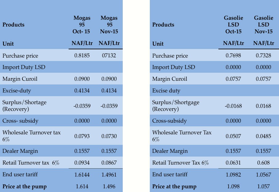 Het gereguleerde tarief voor Mogas 95 vertoont een daling van circa NAF. 0,12 per liter. Deze is het gevolg van de daling van circa NAF. 0,10 in de aankoopprijs die gebaseerd is op de facturen van september 2015. Deze daling is ook in lijn met de ontwikkeling van de internationale Platts notering voor Mogas 95. Verder treedt er deze maand geen verandering op in de overschot/tekort component, omdat deze steeds aan het begin van een kwartaal wordt aangepast.