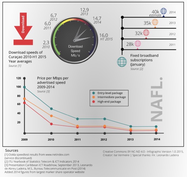 In recent years, the BT&P has observed a strong growth in numbers and speeds of the broadband connections in Curaçao (from the ‘supply side’ of the market). The affordability of broadband has also improved significantly over the past 5 years (Click here for an illustration).